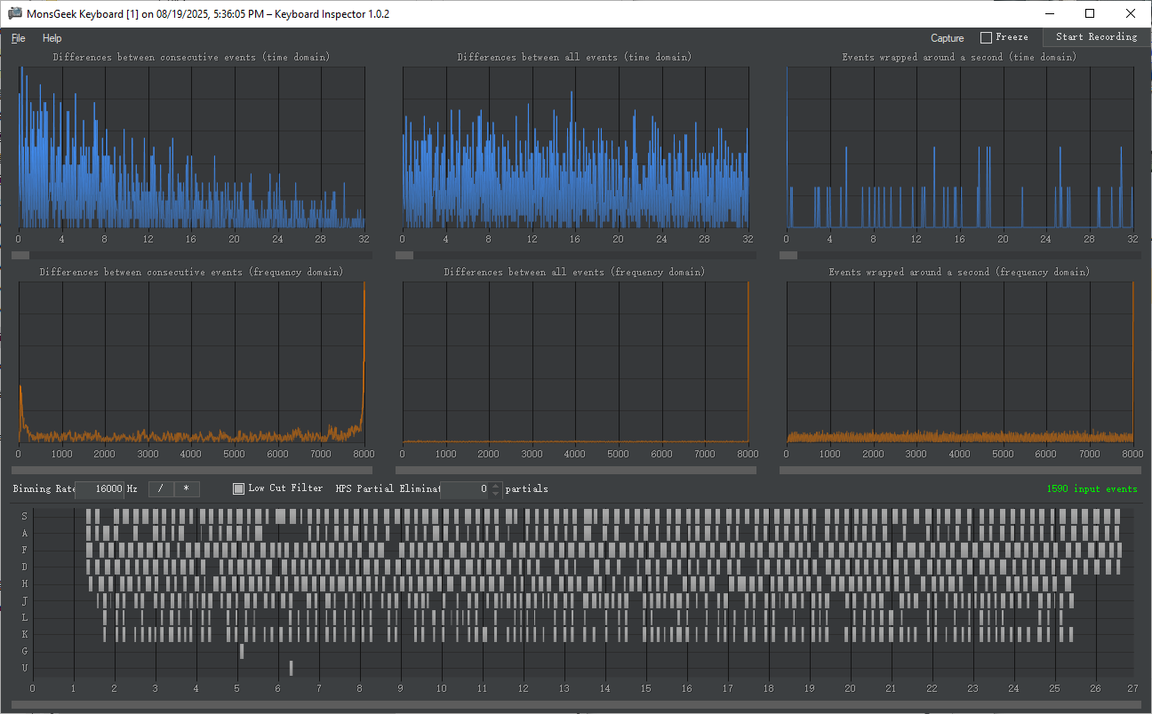 • Method: Download, run, “Start Recording,” rapidly spam keys for ~10 seconds, “Stop Recording,” then set “Binning Rate” (e.g., 16000Hz for 8KHz testing) for analysis.